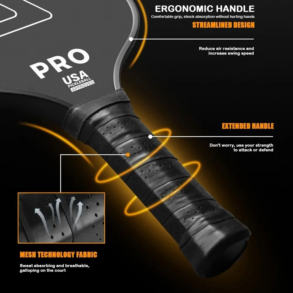 1. Premium Quality Pickleball Paddles: The pickleball paddles set is designed with unique carbon fiber and polypropylene honeycomb core technology. Provides exceptional power and control. Polypropylene honeycomb technology reduces vibration and achieves stable speed, resulting in optimal ball strike feel. The carbon fiber surface provides excellent rotational performance. The pickleball racket lightweight,strong and durable.