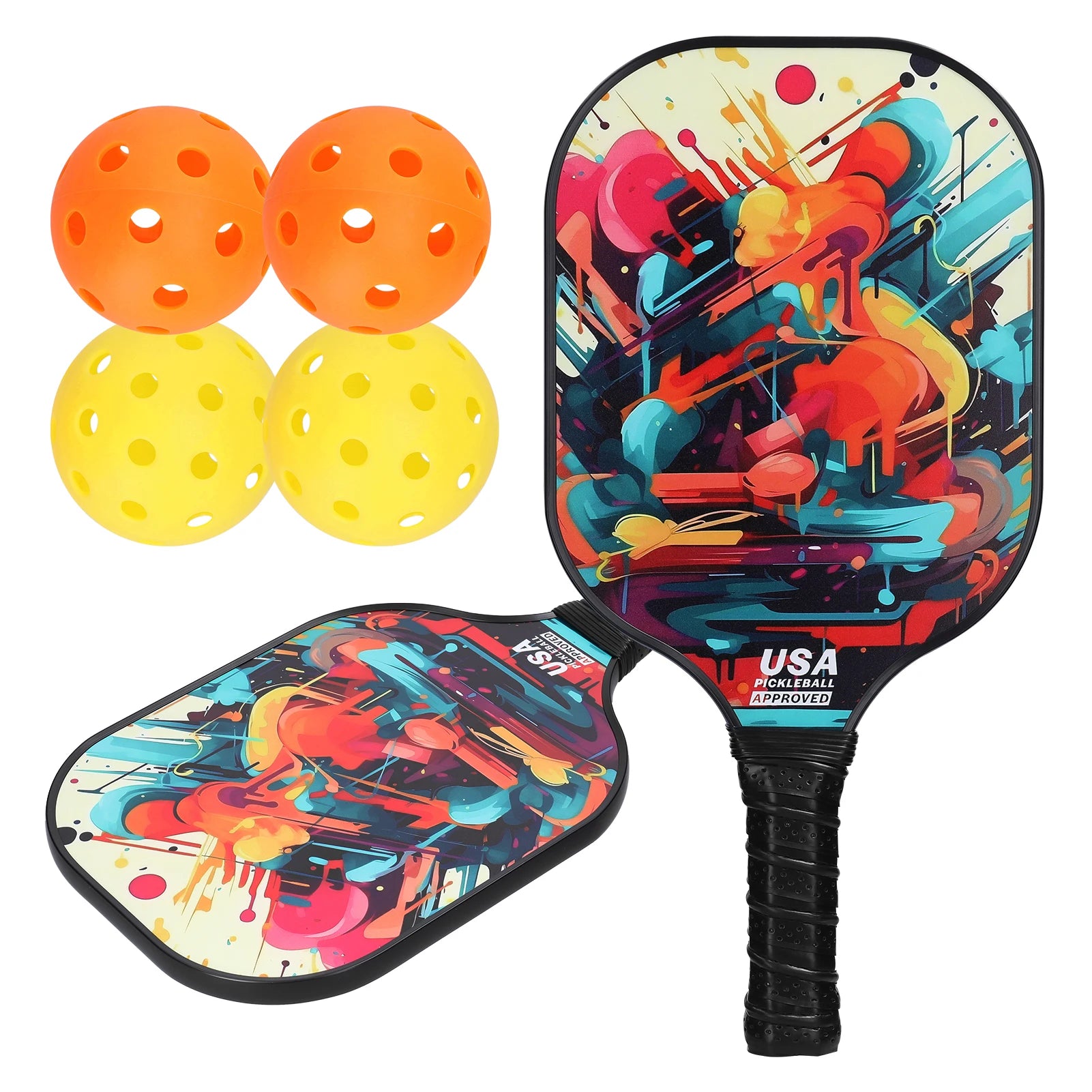 1. The pickleball set is the perfect choice for beginners and seasoned players alike. This set includes 2 paddles, four balls, and a convenient storage bag.2. Get ready to take your pickleball game to the nextlevel with this fine quality pickleball set. Made from wear-resistant fiberglas, these paddles are designed to provides perfect control and accurate on the court.